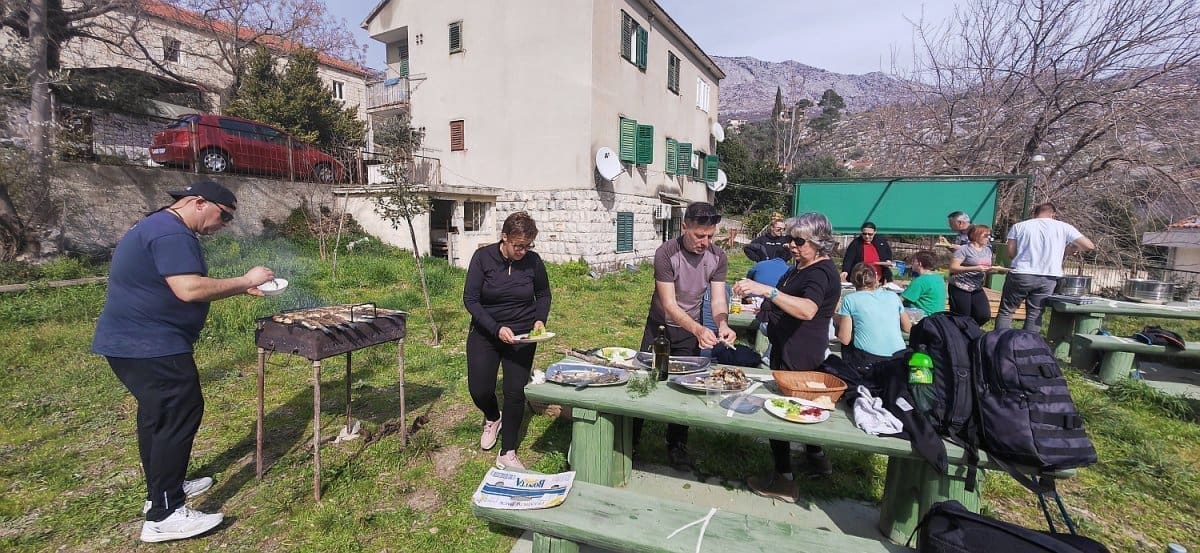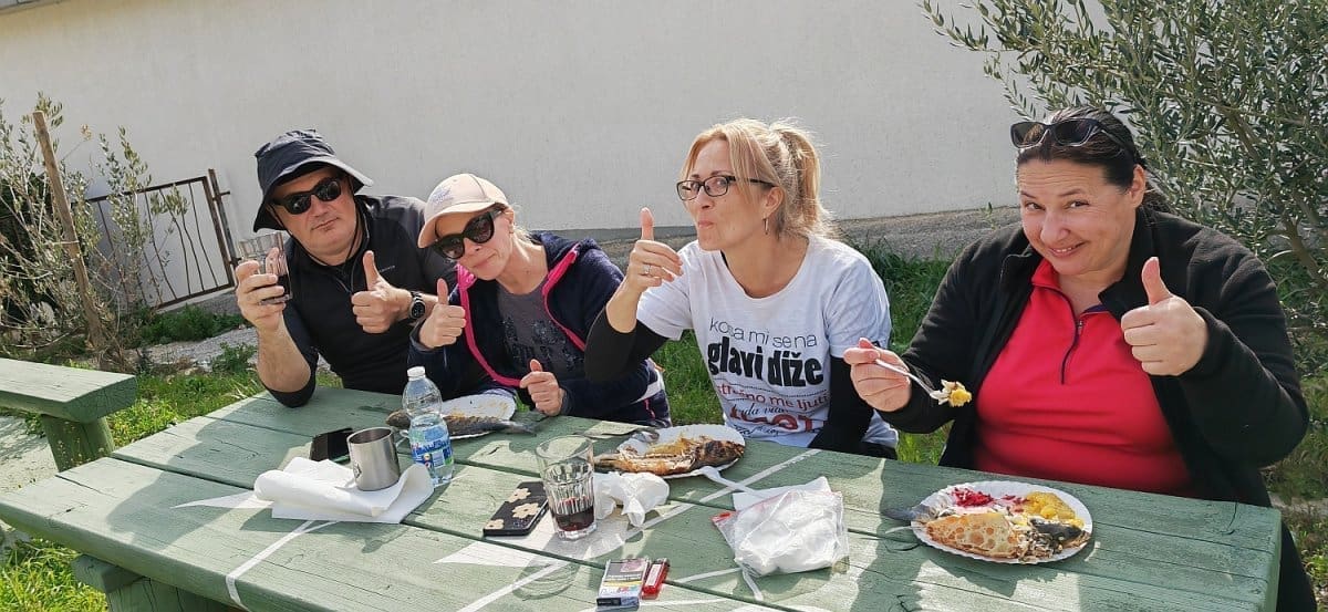 Izlet je završio ispred prostorija udruga gdje se pekla riba iz ribnjaka te kuhala pura koja je samljevena u Antoničinom mlinu na rijeci Žrnovnici.