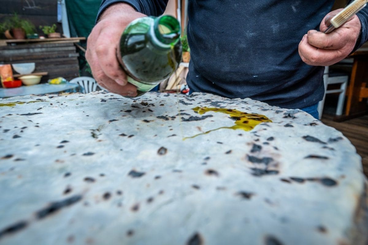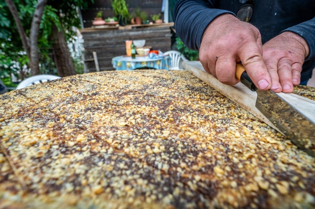 Veći dio procedure izrade slatkog soparnika je identičan "običnome". Kada se soparnik ispraši nakon pečenja, namažemo maslinovim uljem stranu koja je bila gornja za vrijeme pečenja, a nakon toga ga okrenemo. Na "čistu" stranu utrljamo luk. Ja suvice sameljem na mašinu od mesa te dobijem gustu "kašu". Netko u nju doda malo prošeka, ako ne, onda se doda malo vode da se ta smjesa može razmazati po tijestu. Bitno je da se gornja strana ne maže uljem prije stavljanja suvica jer se ništa ne bi primilo. Potom se po svemu razmaže ulje, pinelom ili rukom. Po tome se onda pospe u sitno isjeckani orah. Nakon svega pospe se malo cukra", govori nam Goran koji je svoje umijeće pokazao pred našim kamerama.
