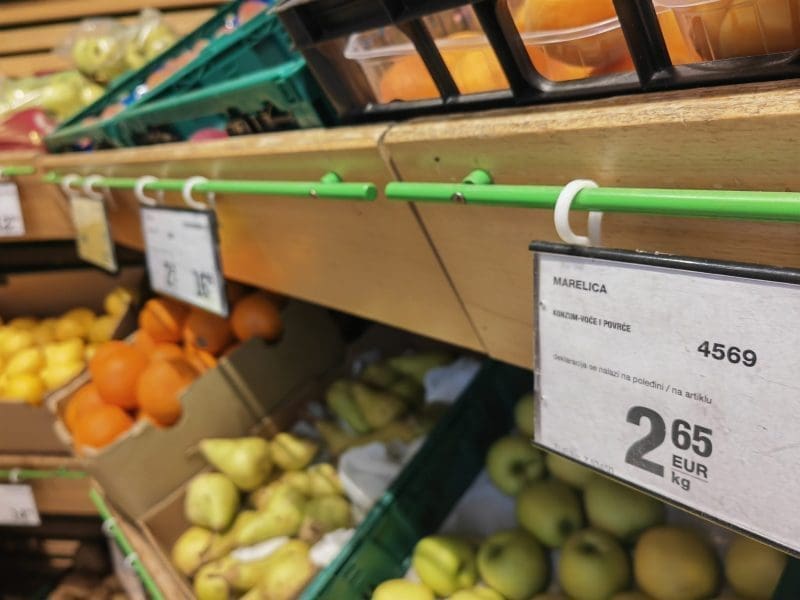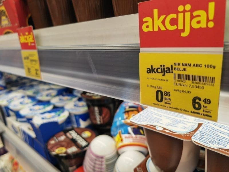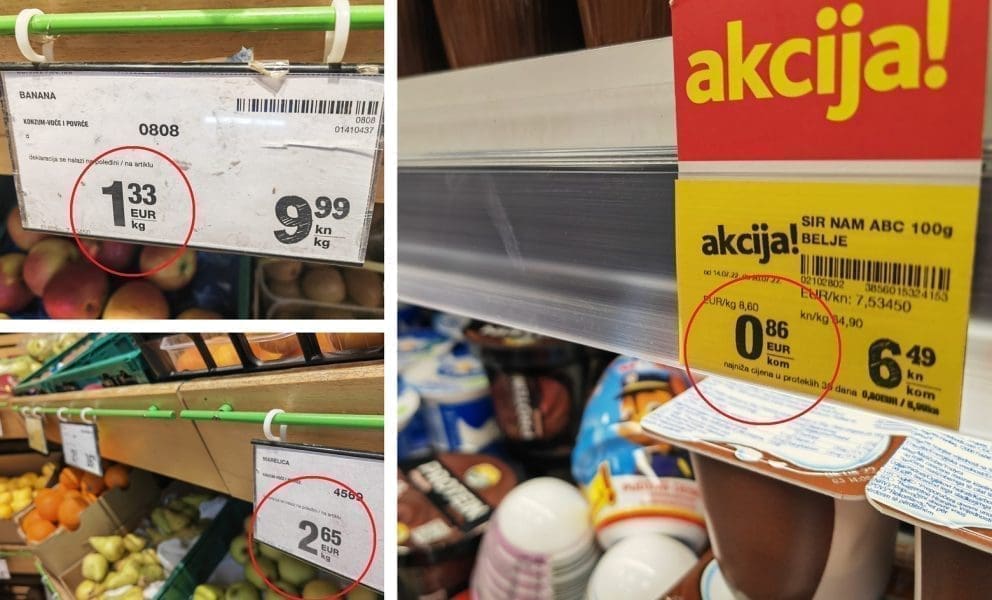 Danas je naš čitatelj u jednom dućanu na istoku Splita snimio police s proizvodima. Potpuno se iznenadio jer je ugledao da su cijene artikala i u eurima i u kunama.