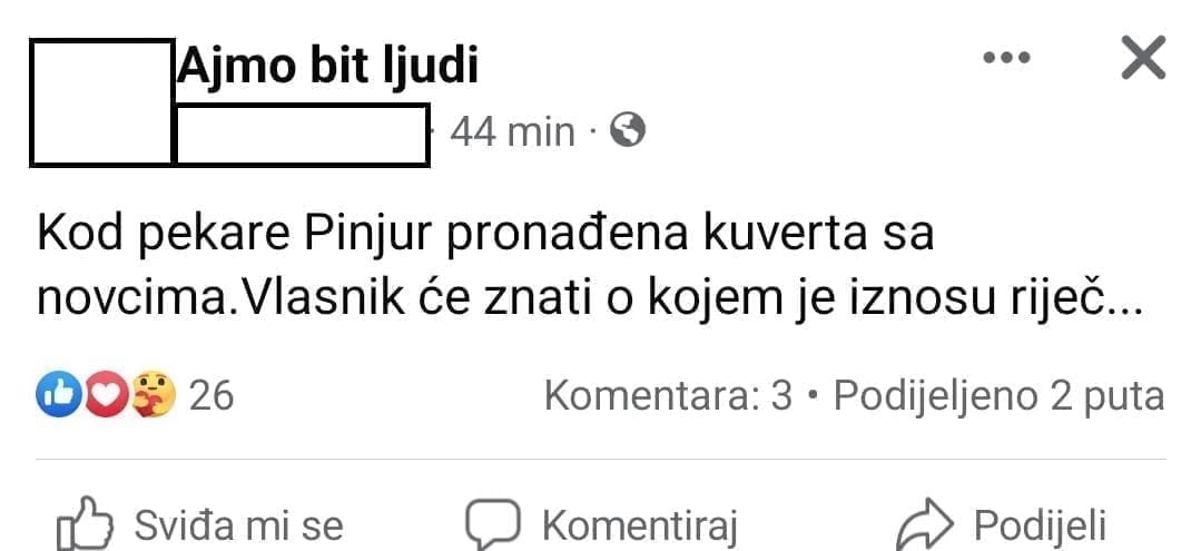 "Kod pekarne Pinjur pronađena je kuverta s novcem. Vlasnik će znati o kojem iznosu je riječ", napisala je.