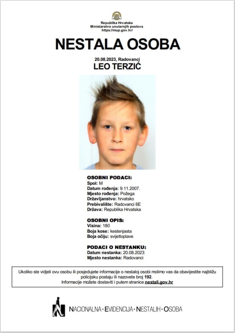 U mjestu Radovanci kod grada Požege nestao 16-godišnji Leo Terzić. Kako se saznaje, Leo je visok 180 centimetara i ima svijetloplave oči.