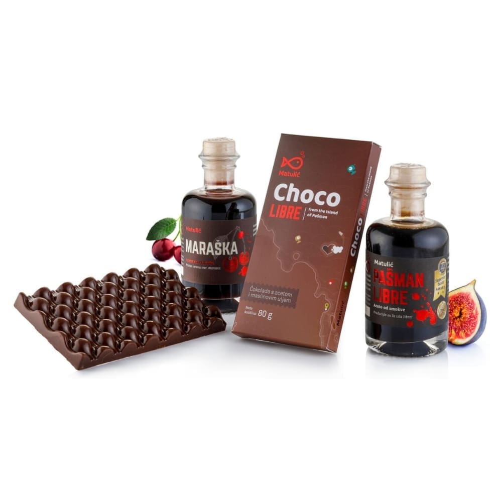 Pašman Libre, poznati aceto od smokve, bio je nepresušna inspiracija za Krstu Matulića, koji ga je poželio isprobati u svim mogućim kombinacijama. Tako je došao na ideju da ga spoji s čokoladom, jer se savršeno slaže s čokoladnim desertima. Upravo iz toga je nastalo ime Choco Libre, kao spoj Pašman Libre aceta i vrhunske tamne čokolade.