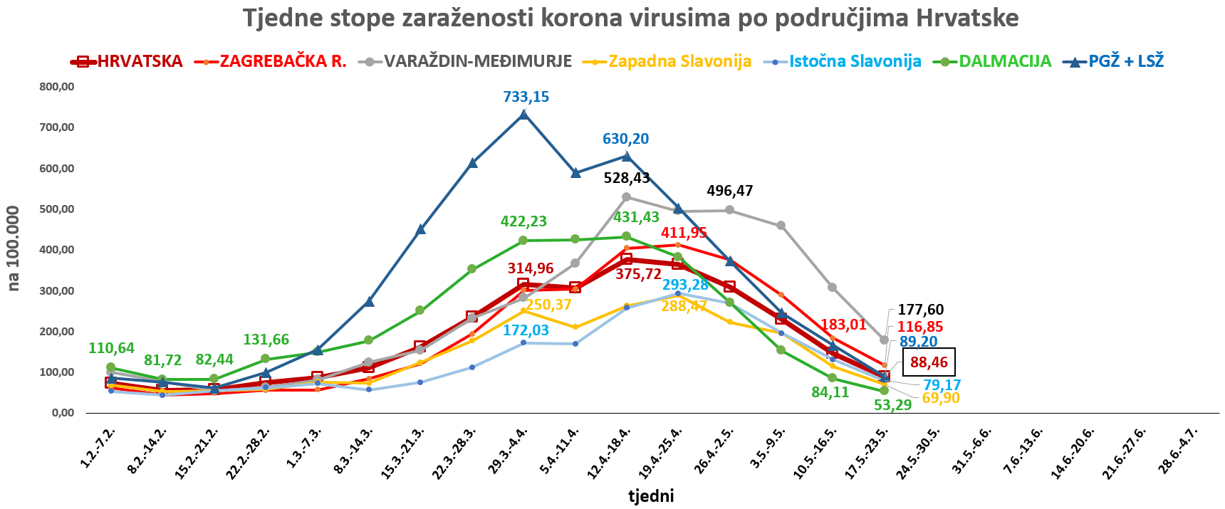Kakvo je stanje u Hrvatskoj i njezinim područjima sada mjesec dana nakon početka popuštanja epidemije s razvidnim, gotovo strelovitim, smanjivanjem broja zaraženih? Sve hrvatske regije pokazuju značajno smanjivanje broja zaraženih. Stope na 100.000 stanovnika za manje od mjesec dana došle su na razinu stopa u mjesecu veljači prije početka zimsko-proljetnog epidemijskog vala koji je svoj vrhunac imao u trećem tjednu do 18. travnja za čitavu Hrvatsku. Sada 23. svibnja manju stopu od one iz mjeseca veljače ima Dalmacija 53.29/100.000. Vrlo blizu su stope u istočnoj i zapadnoj Slavoniji. Još su visoke stope u zagrebačkoj regiji i na sjeveru u Varaždinskoj i Međimurskoj županiji, ali i one će ovakvim trendom smanjivanja kroz koji tjedan dostići stope područja na jugu.