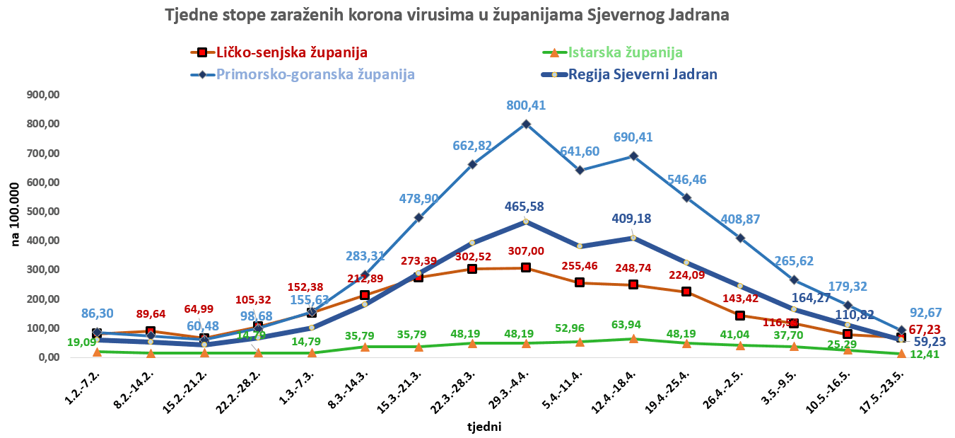 U grafičkom prikazu kretanja tjednih stopa zaraženih korona virusima po regijama nije uvrštena cijela Regija Sjeverni Jadran. Izostavljena je Istarska županija te su prikazani podaci i urađeni pokazatelji zbirno samo za Primorsko-goransku županiju (PGŽ) i Ličko-senjsku županiju (LSŽ).