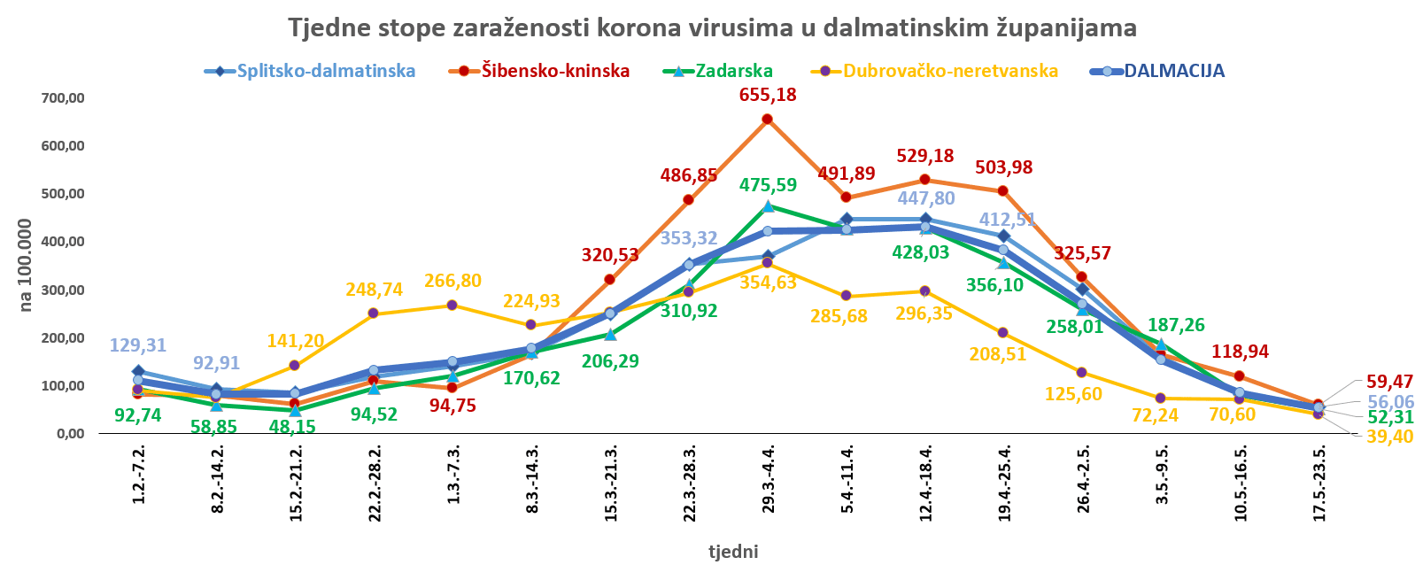 Tzv. treći pandemijski val od veljače do svibnja 2021. godine zabilježen je u sve četiri dalmatinske županije.