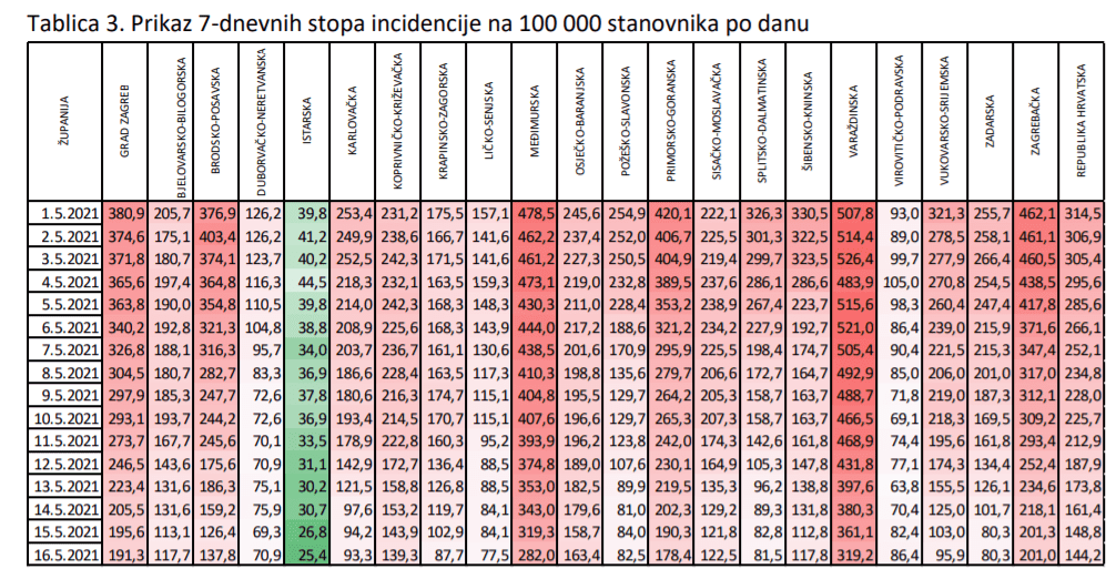 U tablici 3. prikazano je kretanje 7-dnevne stope po danu tijekom posljednjeg tjedna s granicom od 50/100 000 stanovnika koja se u neki zemljama uzima kao jedan od kriterija u procjeni epidemiološke situacije. U posljednja dva tjedna, zbog stabilizacije epidemiološke situacije dolazi do pada stope potvrđenih slučajeva u gotovo svim županijama.