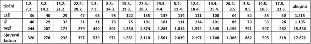 Tablica 2. Tjedni brojevi zaraženih korona virusima u županijama sjevernog Jadrana od 1. veljače do 23. svibnja 2021.