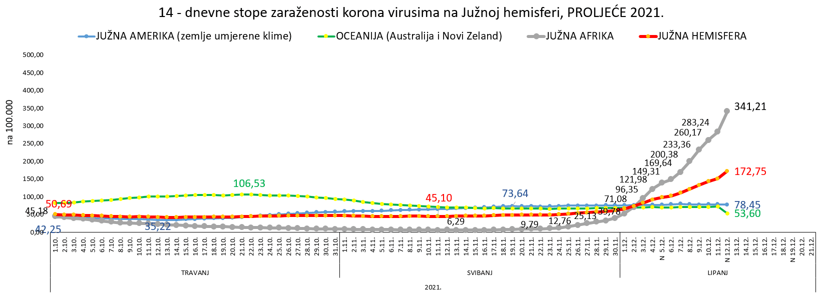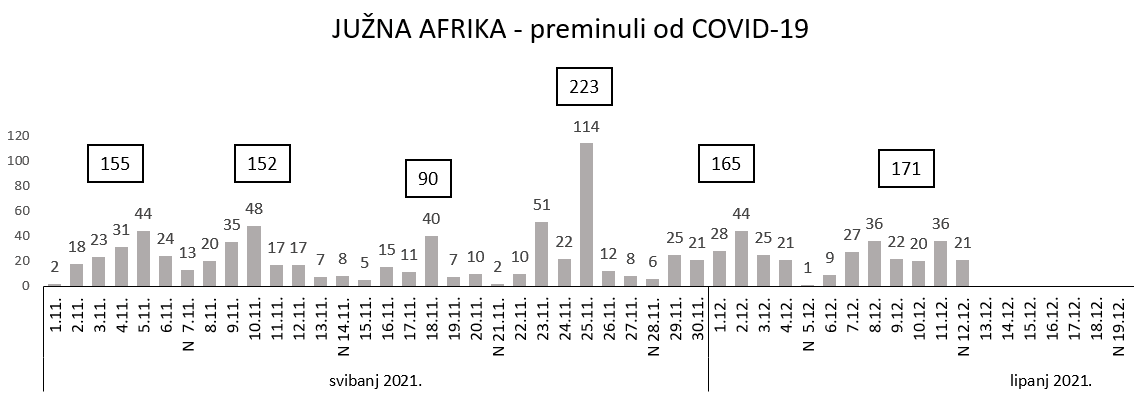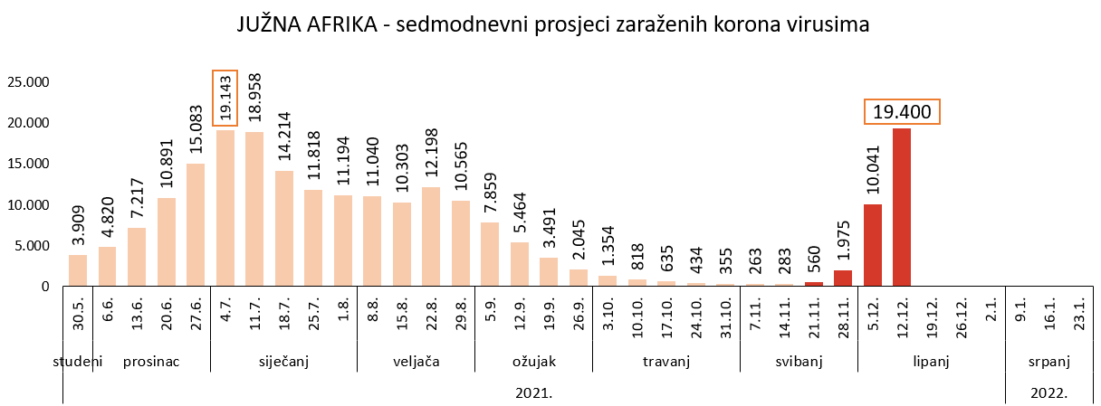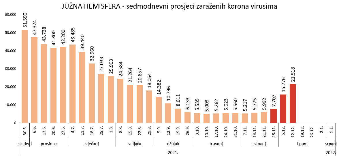 Na kraju tjedna od 6. do 12. prosinca na sjevernoj hemisferi (SH), a lipnja na južnoj hemisferi (JH), premda je nedjelja u Južnoj Africi (JA) zabilježeno je 37.875 novozaraženih korona virusom, dvostruko više nego prethodnog dana. Kroz cijeli protekli tjedan od 6. do 12. prosinca prijavljeno je ukupno 135.803 novozaraženih koronom dvostruko više od prosječnog godišnjeg broja zaraženih sezonskom gripom u Hrvatskoj.