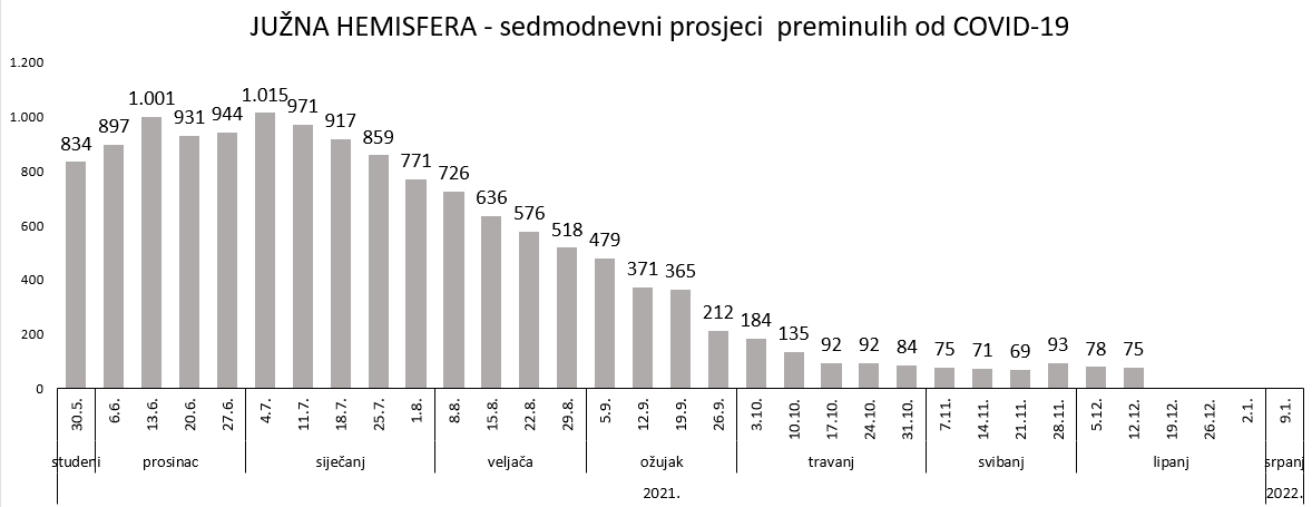 Brojevi preminulih po danima ne pokazuju značajnih povećanja. Dapače, oni su gotovo u prosjeku broja preminuli u razdoblju od prije mjesec dana. Nema podataka koji sojevi virusa korone su uzroci smrti, ali delta soj je još uvijek prevladavajući u cirkulaciji diljem svijeta pa tako i u JA gdje je još uvijek vodeći uzrok smrti od korona virusa.