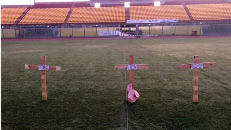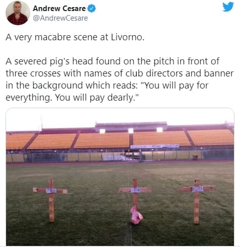 Tri križa i glava svinje zabodene su u travnjaku Armanda Picchija, zajedno s prijetećim transparentom koji je visio na tribinama. Ovo je poruka koju su neki obožavatelji željeli poslati vlasnicima Livorna - Spinelli, Carrano group i Aimo.