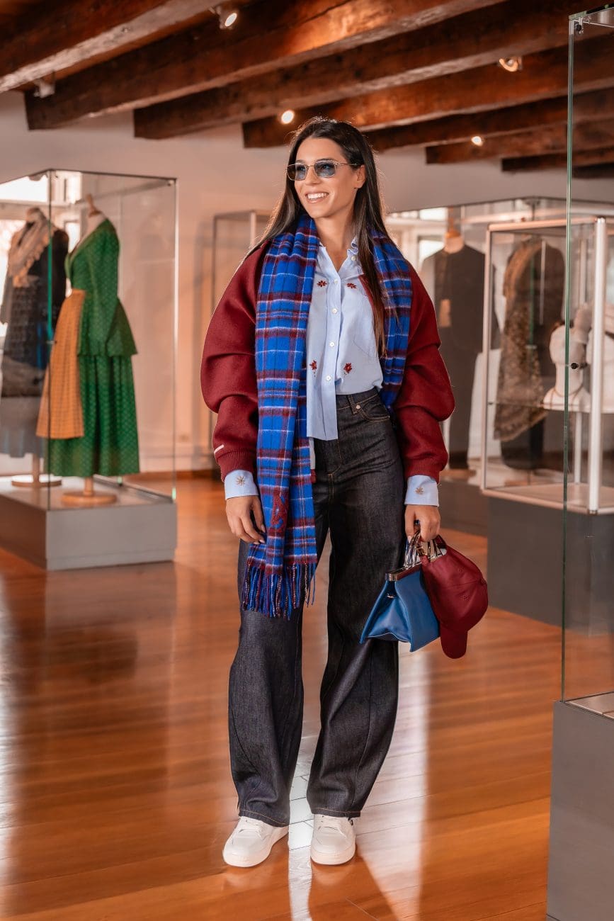 Bomber jakna simbol je sportskog stila odijevanja, no u ovom slučaju pokazuje svoju sofisticiranu stranu. U trendi burgundy boji, ovaj statement komad stilistica Jokera uparila je s još jednim must-have komadom nove sezone – popularnim barrel trapericama koje ovom sofisticiranom stajlingu dodaju dozu buntovnosti. Uz vječne klasike – bijele tenisice, svijetlo plavu košulju i šal kariranog uzorka, imate kombinaciju zanimljivog kolorita koja će razveseliti i najtmurniji jesenski dan.