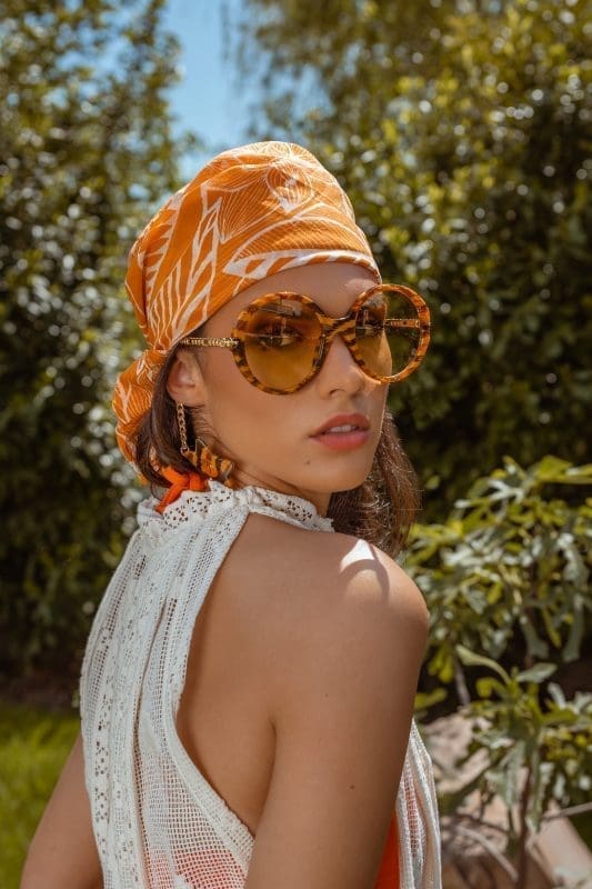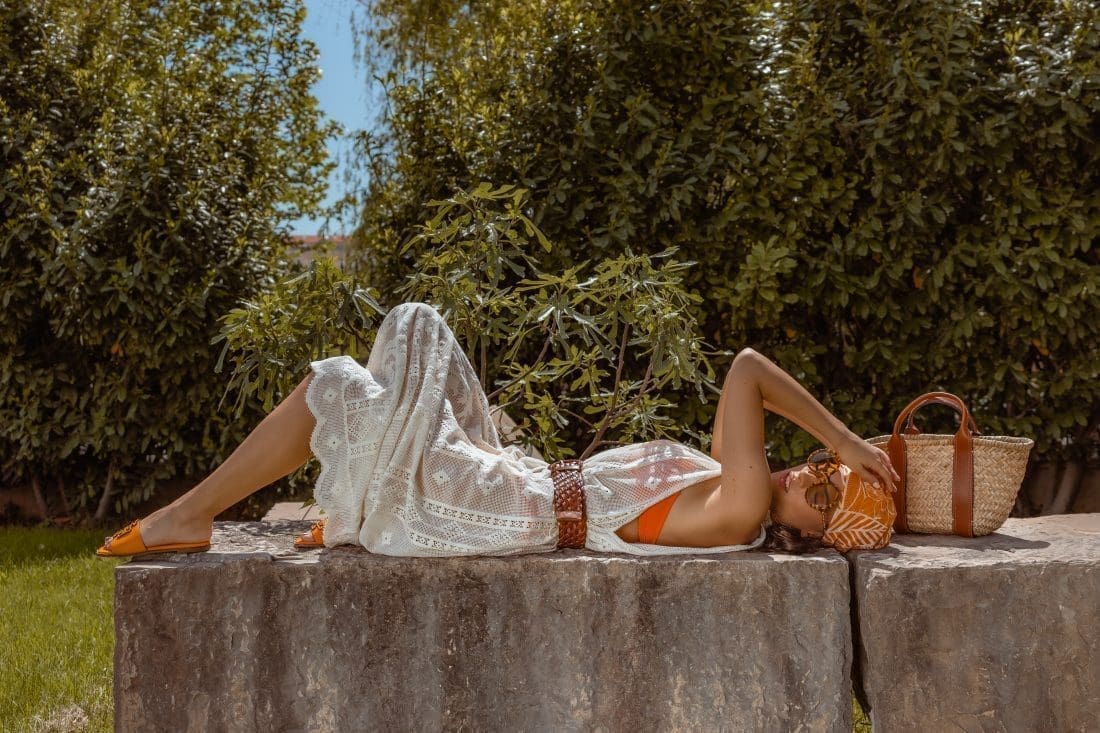 Nijedno ljeto ne može proći bez lagane bijele haljine. Ova, kačkana u boho varijanti, oplemenjena je narančastom kao jednom od boja sezone kako bi kompletan outfit postao atraktivniji – marama, natikače, remen, torba i sunčane naočale, sve je u službi naglašavanja prozračnosti ključnog komada.