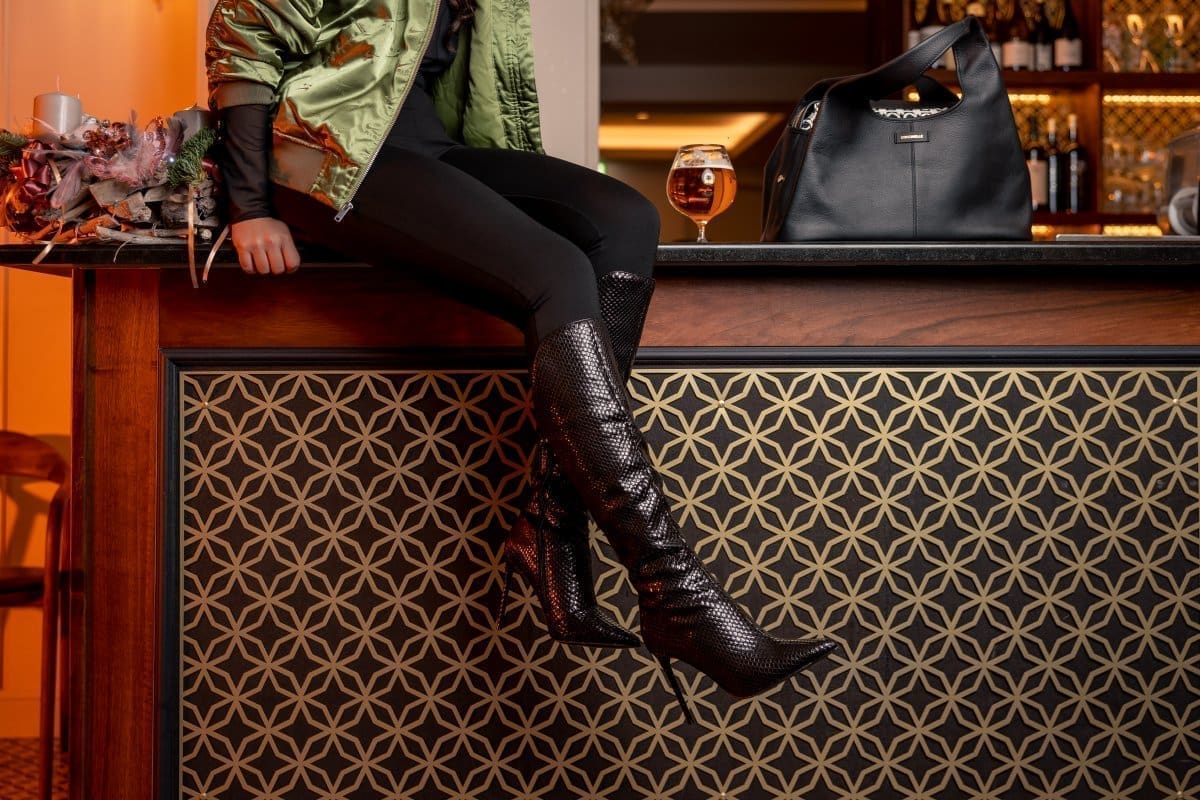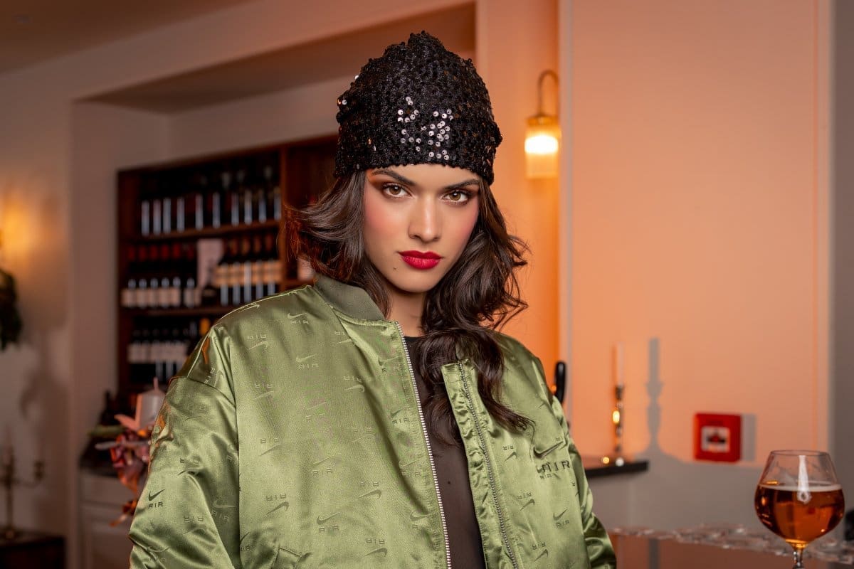 Tko kaže da štikla i bomberica ne idu zajedno? U ovoj nekonvencionalnoj varijanti ‘za van’ ove se dvije krajnosti idealno nadopunjuju – sportska, edgy jakna ublažava strogu liniju čizama visoke sare i još više potpetice, a da cjelokupni dojam ne bude previše opasan, tu je kapa koja nježno uokviruje lice.