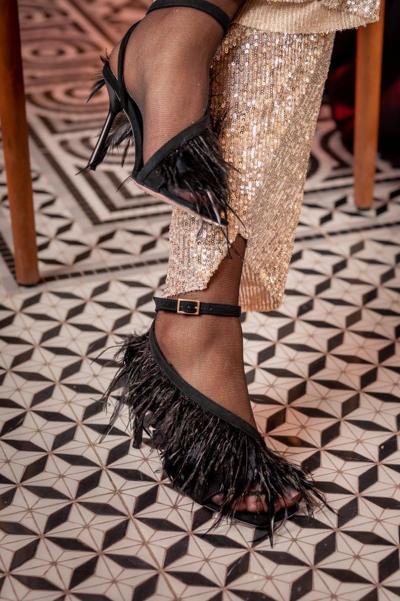 Želite li zasjati u danima božićnih domjenaka, treći modni prijedlog iz ovog editoriala je kao stvoren za takve prigode. Relativno konzervativan osnovni odabir dolčevite i hlača ‘razbijen’ je mnoštvom detalja koji su idealni za isticanje u gomili: detalji perja na salonkama i korzetu, glitter na hlačama, neobična torbica…