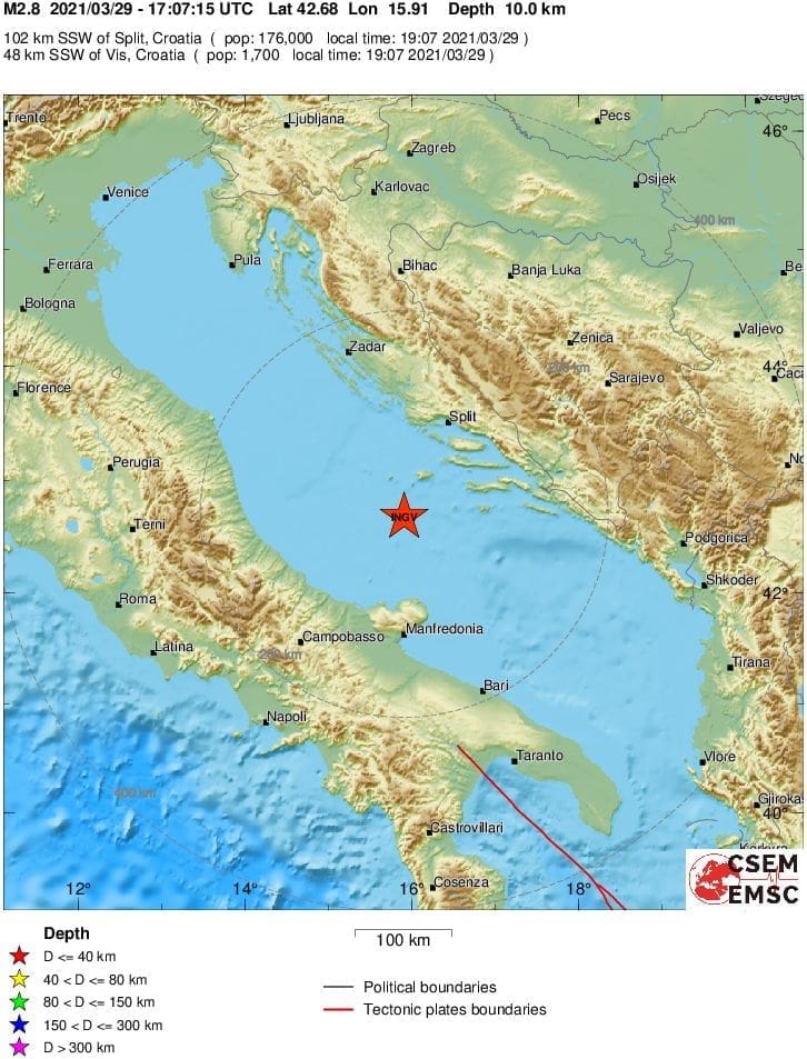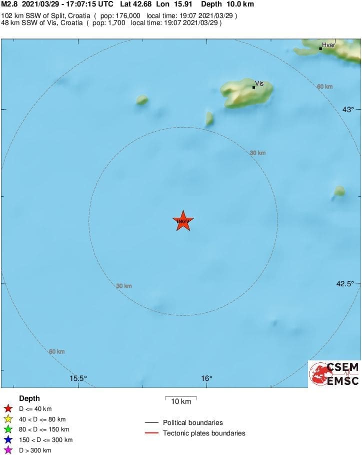 Prema podacima EMSC-a, magnituda mu je bila 2.8 prema Richteru, a epicentar 48 kilometara jug-jugozapadno od Visa.