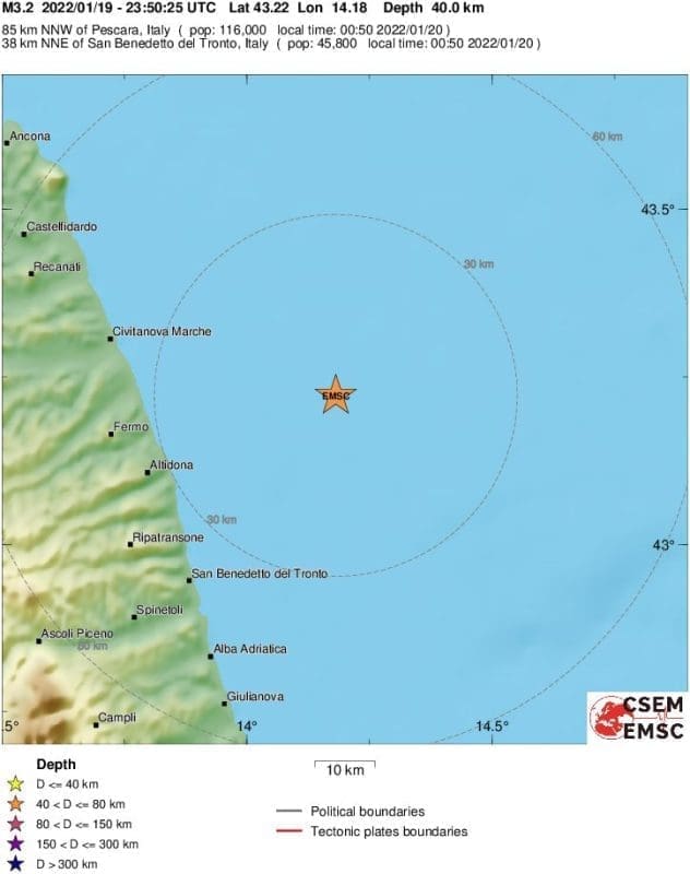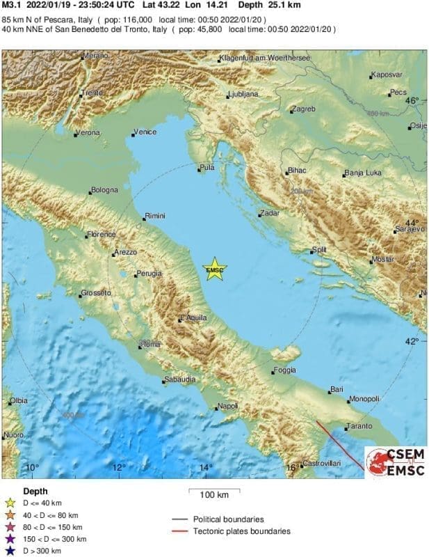 Prema podacima EMSC-a, magnituda potresa je iznosila 3.1 prema Richteru, a epicentar je bio u moru, 85 kilometara sjeverno od Pescare.