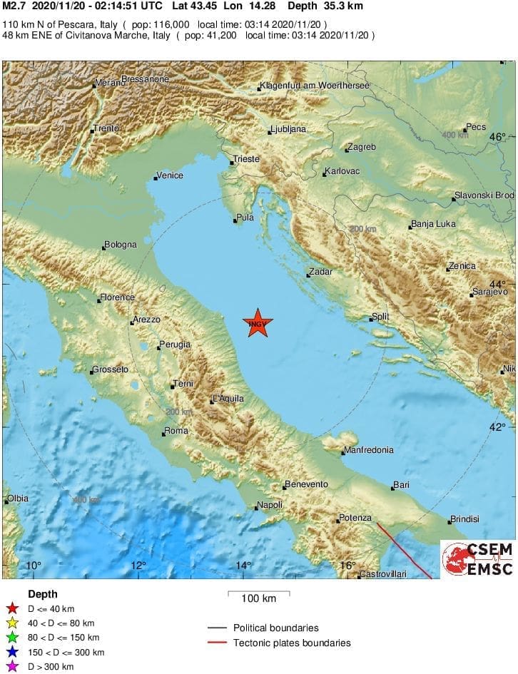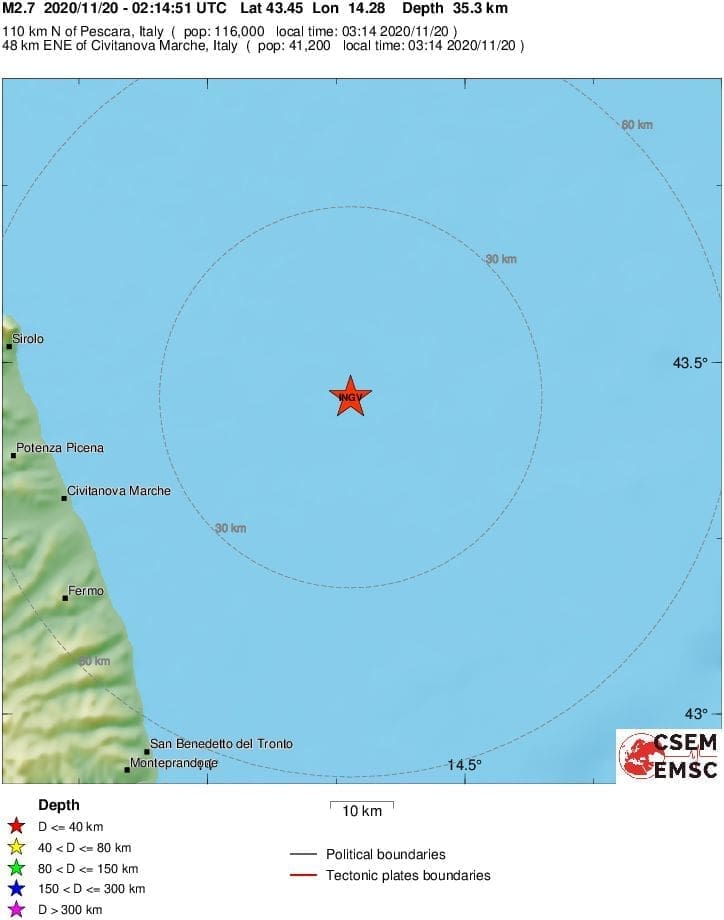 Prema podacima EMSC-a, magnituda potresa bila je 2.7 po Richteru, a epicentar 100 kilometara jugozapadno od Zadra i 60 kilometara istok-jugoistočno od Ancone.