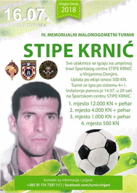 Još svega par dana ostalo je do početka Memorijalnog malonogometnog turnira u Donjim Vinjanima pokraj Imotskog, koji se svake godine u srpnju igra u spomen na Stipu Krnića, heroja Domovinskog rata koji se hrabro poginuo na Gospićkom ratištu.