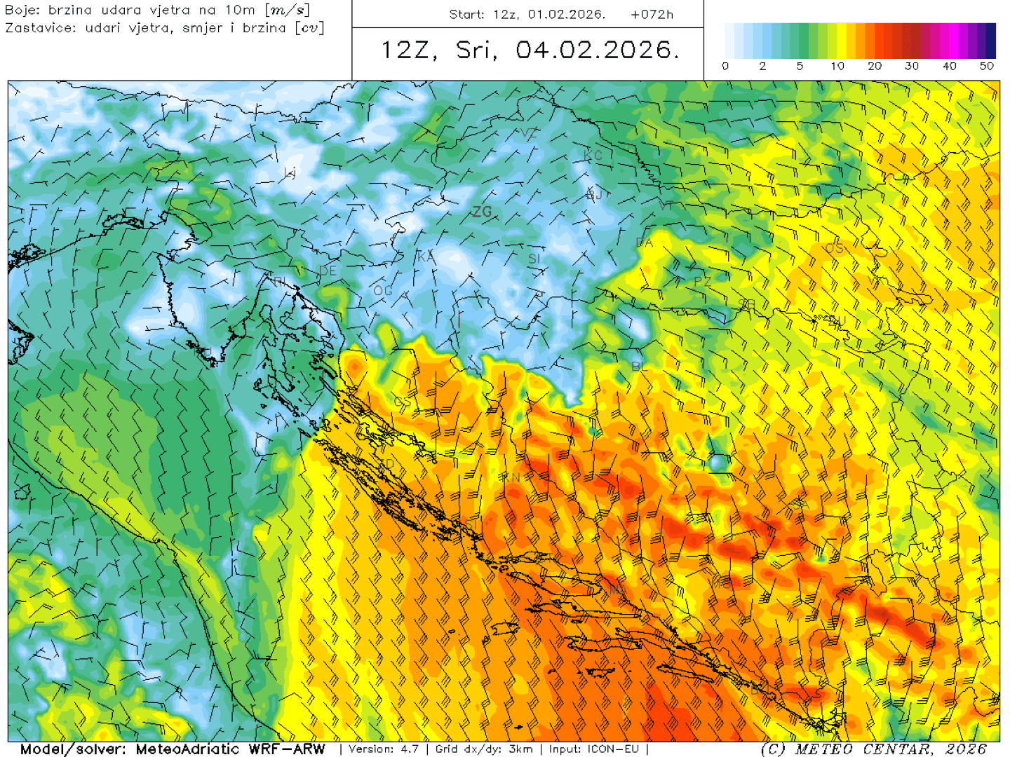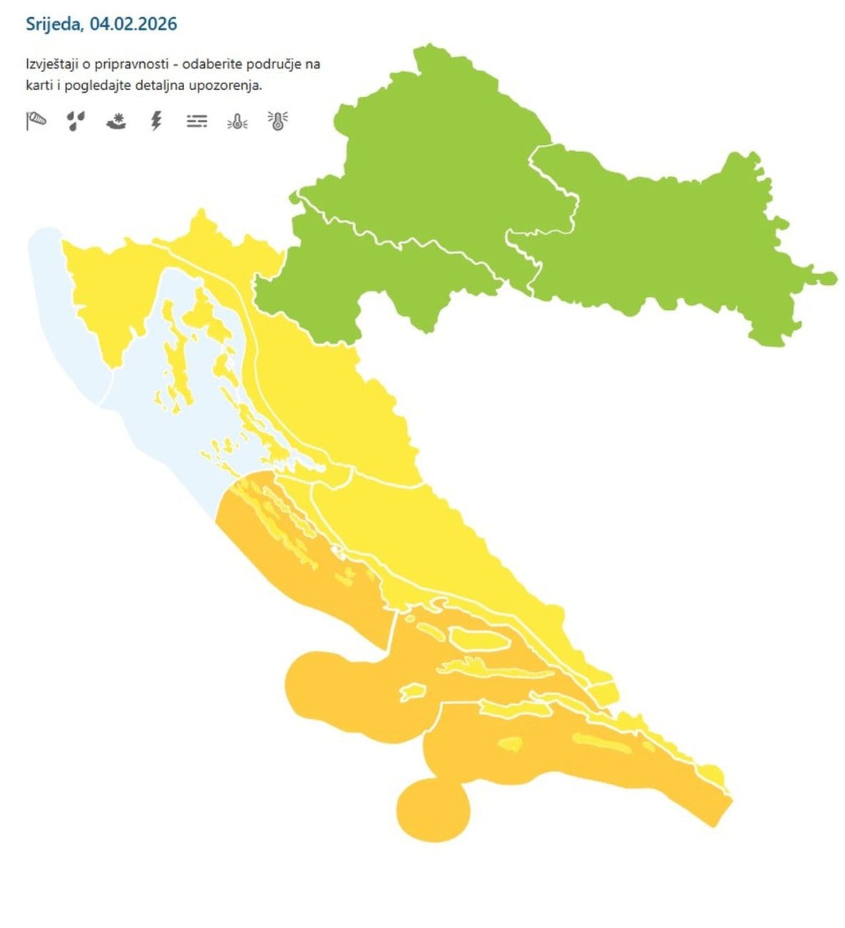 DHMZ je unutar sustava MeteoAlarm za utorak i srijedu izdao narančasto upozorenje za more Dalmacije u utorak i srijedu zbog toga jer predviđaju udare do 110 km/h. Vjerojatno neće biti iznenađujuće da se u međuvremenu stupanj za srijedu podigne na crveni.