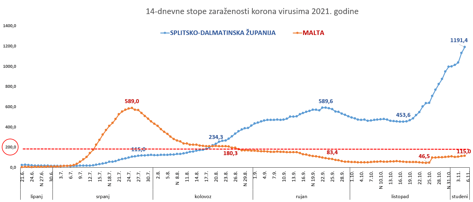 Dovoljan razlog da u SDŽ odnosno Hrvatskoj stope zaraženosti u početku studenog „lete u nebo“, a Malta je na stopama zaraženosti ispod epidemijske razine, ispod zone rizika od preko 200/100.000 stanovnika.
