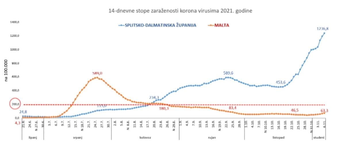 Dovoljan razlog da u SDŽ odnosno Hrvatskoj stope zaraženosti u početku studenog „lete u nebo“, a Malta je na stopama zaraženosti ispod epidemijske razine, ispod zone rizika od preko 200/100.000 stanovnika.