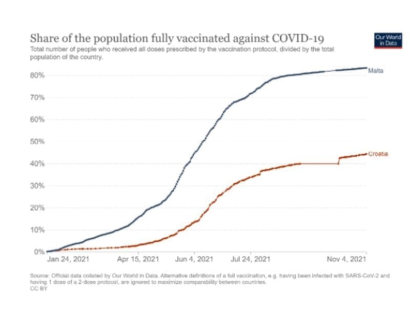 Sada na početku mjeseca studenog Malta ima potpunu procijepljenost iznad 80%, a Hrvatska manje od 50% pa tako i SDŽ manje od 45%.