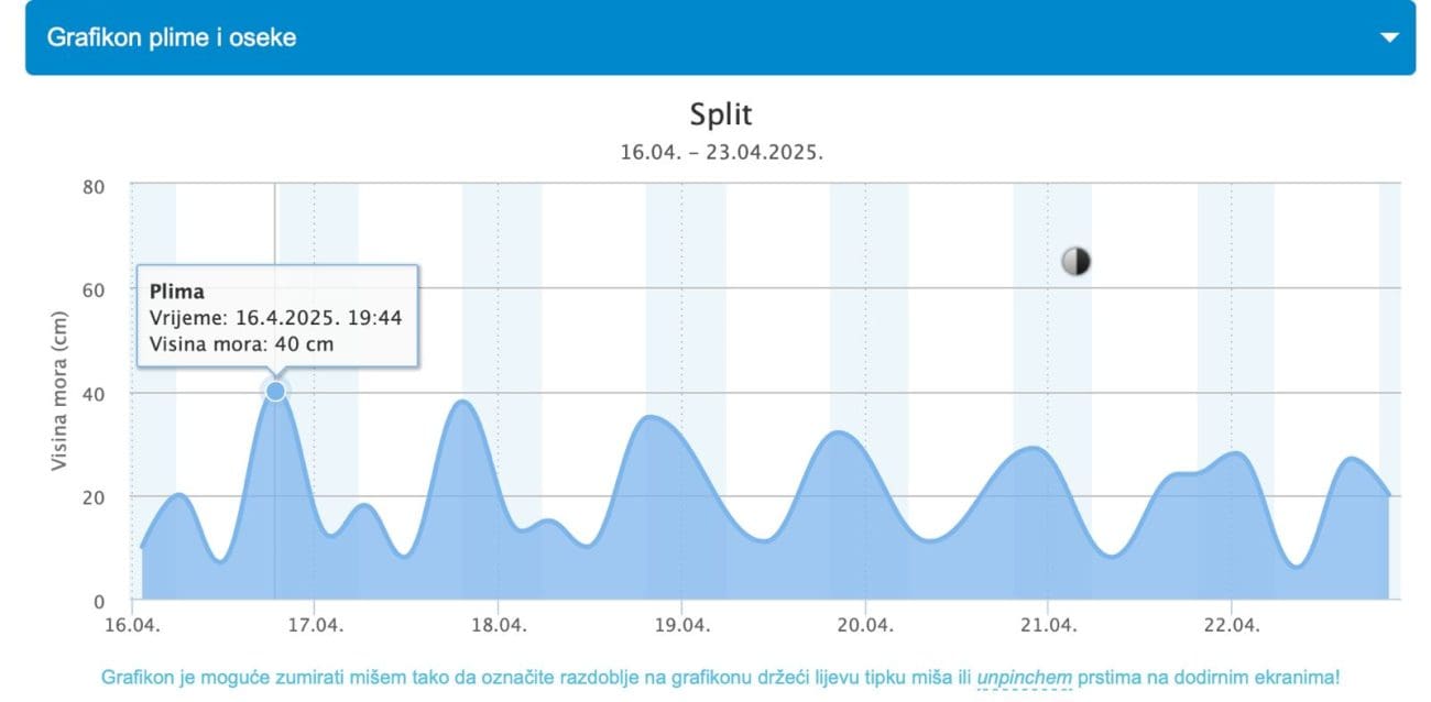 Zbog niskog tlaka i višednevnog juga, u kombinaciji s lunarnom plimom, kasno poslijepodne i navečer moguća je pojava ciklonalne plime, odnosno plavljenja nižih dijelova obale. Prognostički modeli za otvoreno more dijela srednjeg i sjevernog Jadrana predviđaju valove preko 5 metara visine.