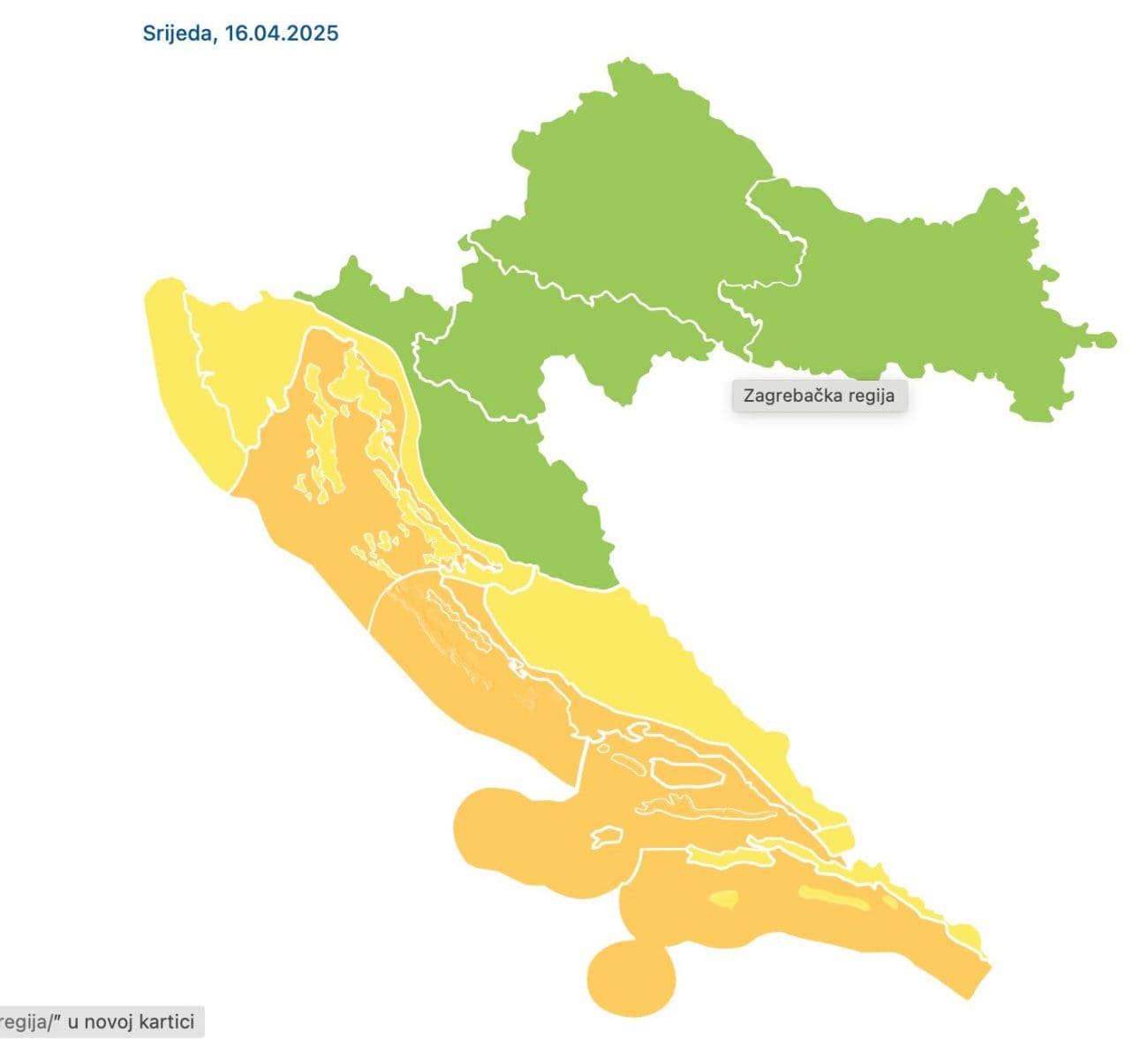 Nad središnjom Italijom nalazi se ciklona koja se produbljava i približava Jadranu zbog čega je tlak zraka u naglom padu, a vjetar će biti u novom jačanju. DHMZ je, unutar sustava MeteoAlarm, izdao narančasti stupanj upozorenja za Dalmaciju zbog olujnog juga. U drugom dijelu dana na dijelu obale i otoka ponovno se očekuju udari preko 100 km/h, a moguće je mjestimice dosezanje orkanskih udara od preko 120 km/h.