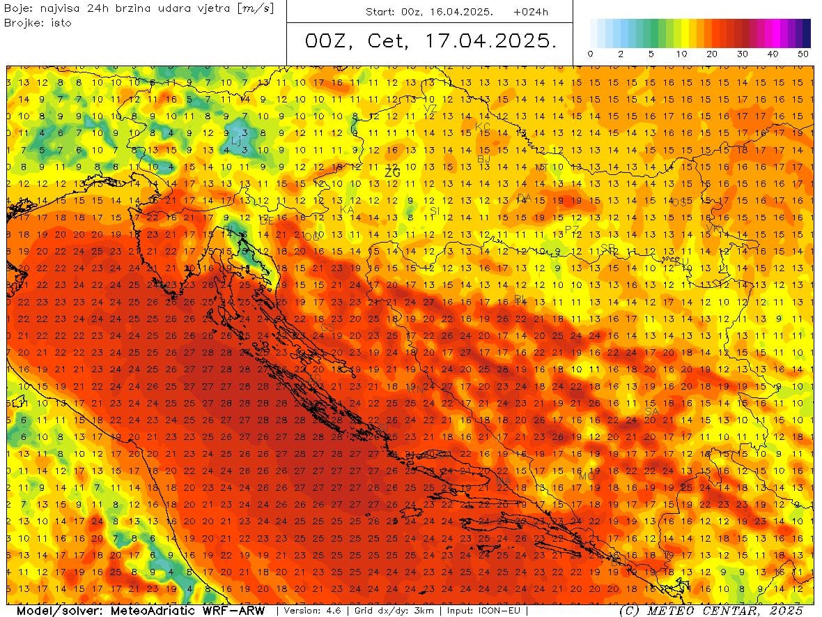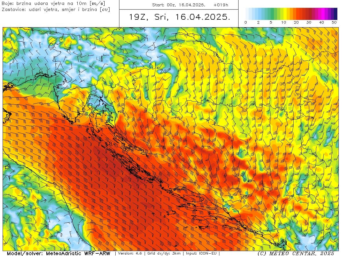 Iznimno vjetrovito vrijeme na Jadranu nastavlja se i tijekom srijede. Prema podacima mreže postaja Pljusak.com, najobilnija kiša posljednja 24 sata pala je na sjevernom Jadranu, osobito u zaleđu Kvarnera gdje je lokalno palo preko 100 litara kiše po kvadratnom metru. U Dalmaciji je kiša bila znatno rjeđa, ali je vjetar bio znatno jači. Jučer su na splitskom području izmjereni orkanski udari vjetra blizu 120 km/h.