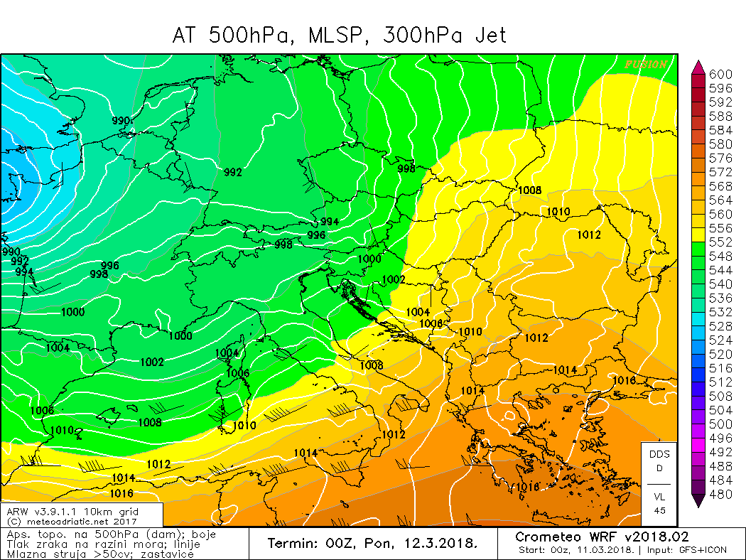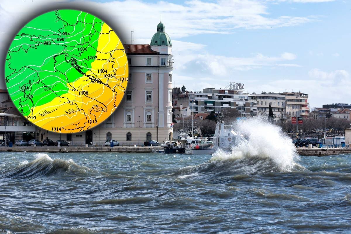 Iako se centar duboke ciklone nalazi daleko od našeg područja, nad Normandijom, ovo polje niskog tlaka zraka djeluje na vrijeme na cijelom Jadranu. Posvuda puše umjereno do jako jugo koje je ponegdje uz obalu i na otocima doseglo olujne udare. Do 16 sati jugo je imalo najjače udare u Hvaru, 89 km/h, a u Splitu 72 km/h. Jugo će još malo pojačati u večernjim satima, u u drugom dijelu noći vjetar će tek malo oslabiti i okretati na lebić i oštro.