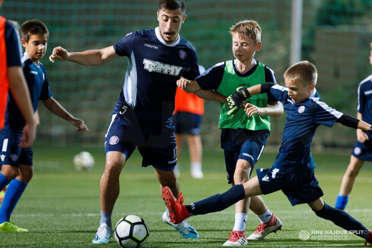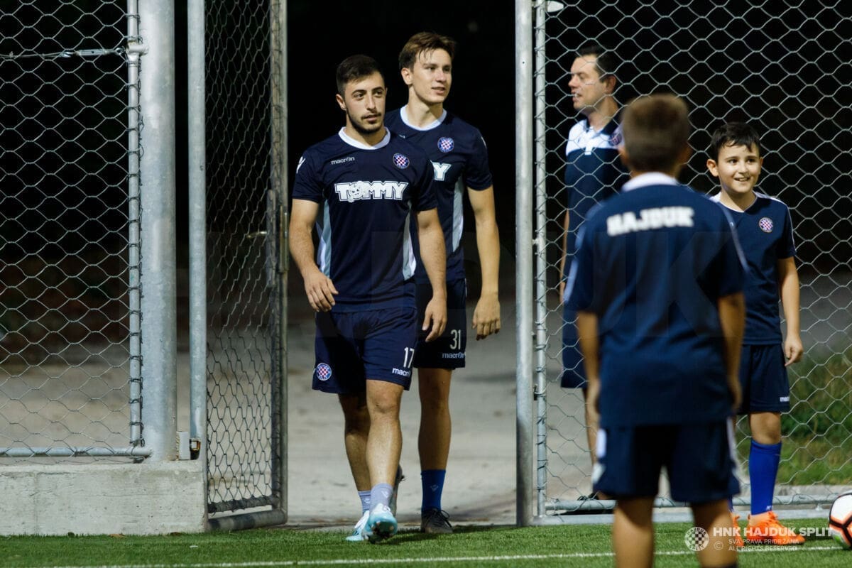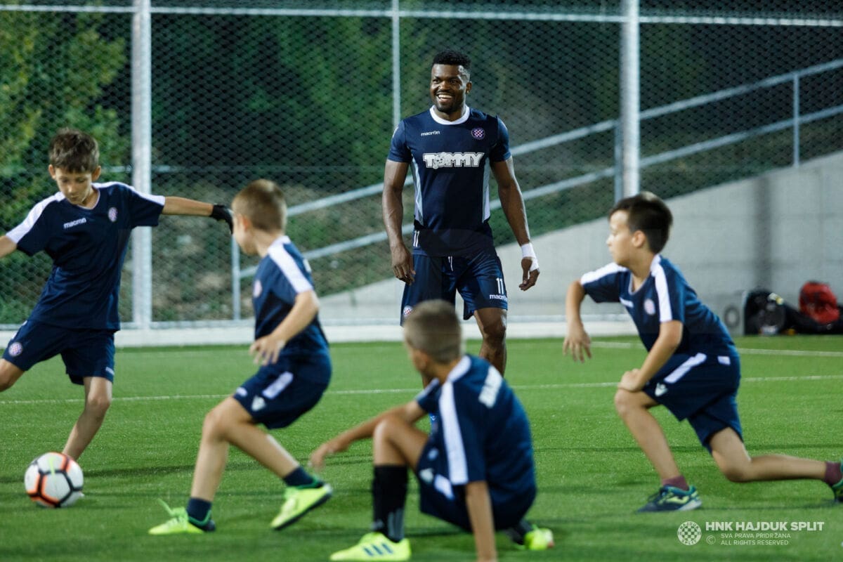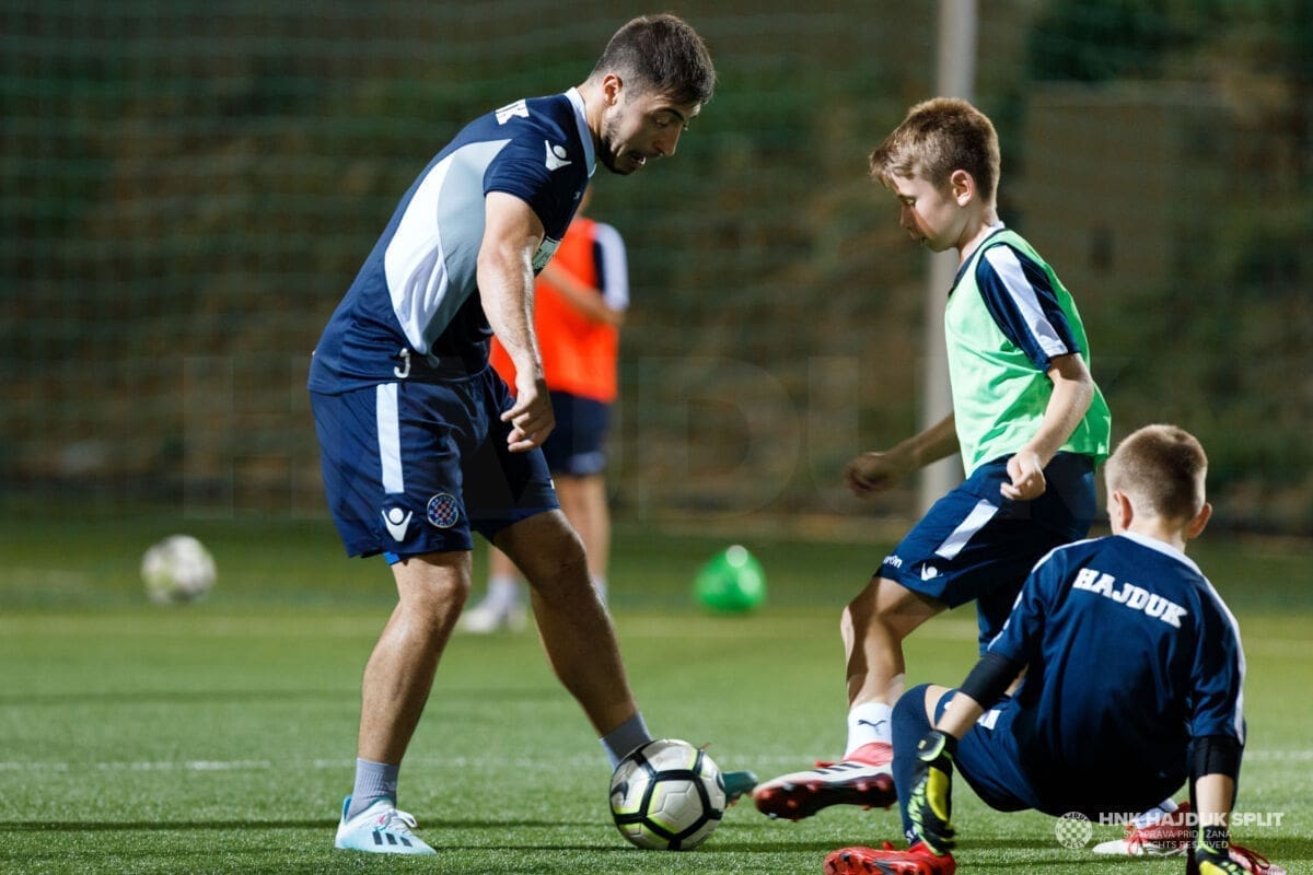 Hajdukovi prvotimci Ivan Dolček i Samuel Eduok predvođeni kapetanom Josipom Juranovićem nakon odrađenog popodnevnog treninga razveselili su svojim posjetom polaznike HNK Hajduk Summer Football School koji se održava na obližnjim terenima Otvorene škole.