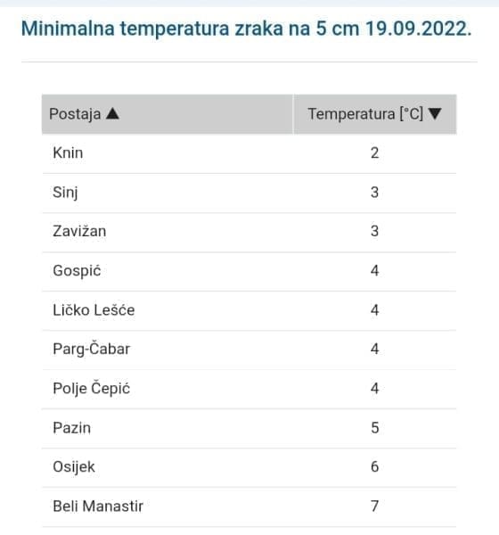 Iza nas je hladno rujansko jutro, najhladnije ovog kalendarskog ljeta. Najniža temperatura zraka jutros u Hrvatskoj izmjerena je na lokaciji Lađana na Biokovu na 1265 metara nadmorske visine. Bilo je tek +1°C. Zanimljivo na znatno višem Svetom Juri bilo je +4°C, baš kao i na Velikoj Duvjakuši na Dinari. Ista vrijednost temperature zraka izmjerena je u mjestu Nisko u kliškoj Zagori. 5°C je bilo u Hrvacama i Vinaliću, a iznimno su rijetka mjesta u Zagori gdje je minimalna temperatura bila viša od 10°C. Uz obalu i na otocima minimalne su temperature zraka bile od 9 do 17°C.