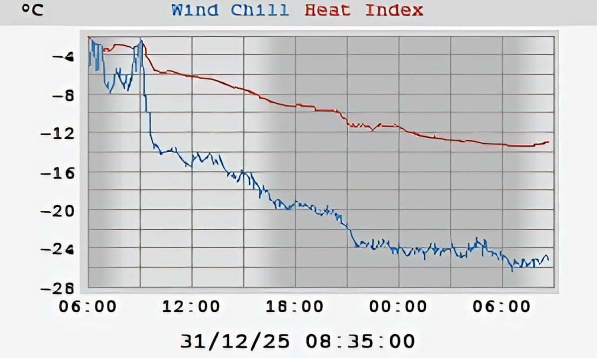 Crometeo mjerna postaja Sinjal na Dinari jutros je mjerila -16, što uz pojedine postajlae u Lici i Gorskom kotaru bila najniža vrijednost izmjerena jutros u hrvatskoj. Na planinarskom skloništu Pume ispod Velike Duvjakuše izmjereno je -14, no uz vjetar na granici orkanskih udara osjet hladnoće iznosio je -26 stupnjeva.
