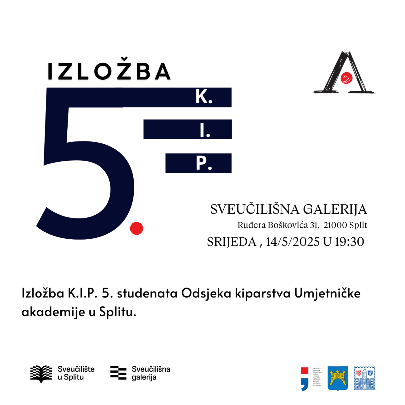 U srijedu, 14. svibnja s početkom u 19 sati, Sveučilišna galerija u Splitu (R. Boškovića 31) ugostit će peto, jubilarno izdanje godišnje izložbe studenata Odsjeka za kiparstvo Umjetničke akademije u Splitu – "K.I.P. 5". Ova izložba, koja je tijekom godina postala važan orijentir za praćenje mladih snaga hrvatske kiparske scene, okuplja 22 autora na početku svojih profesionalnih putanja.