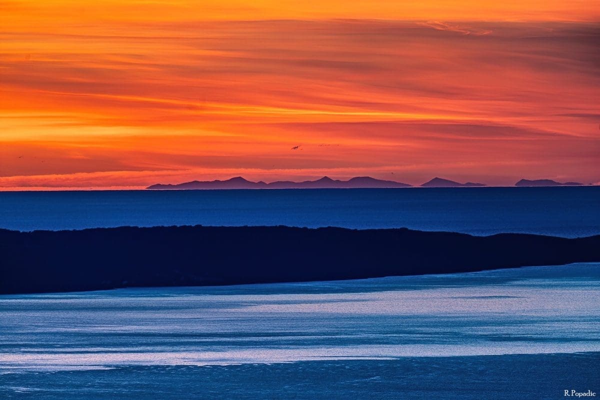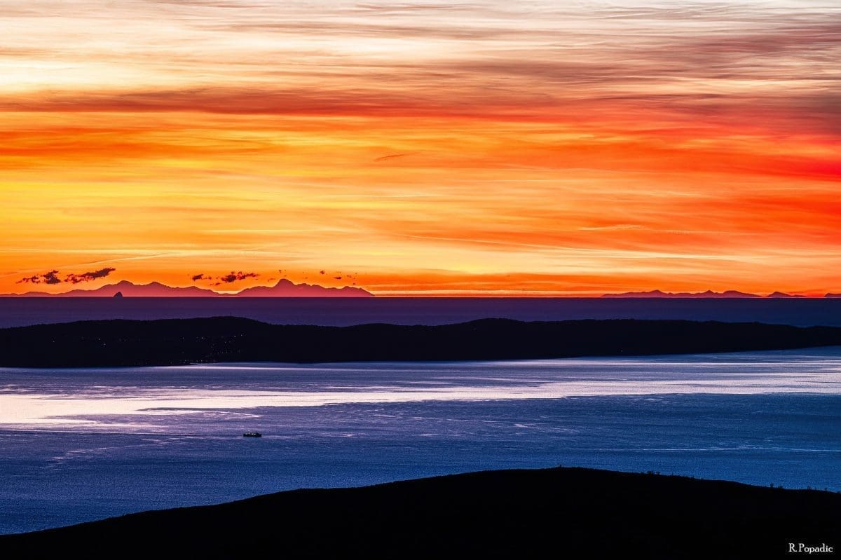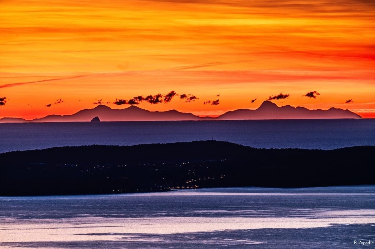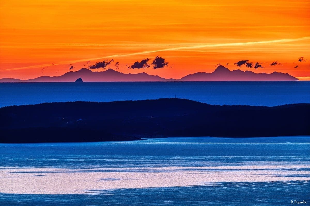 Još zapadnije na horizontu vidi se niz vrhova iznad 2.5000 m. Ovo je moguće vidjeti i zbog dobre vidljivosti koja je nastupila nakon dvodnevne bure, ali i pojave loma svjetlosti u atmosferi -superrefrakcije, koja omogućuje vidjeti i ono što je ispod horizonta.