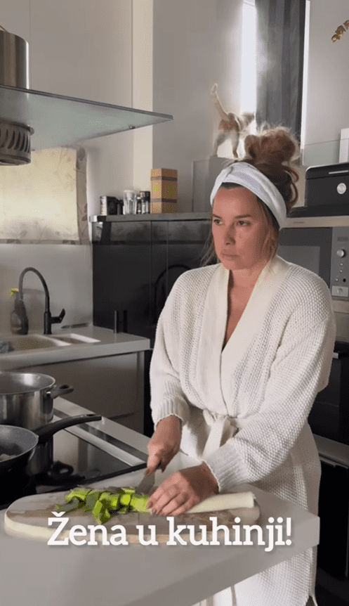 Surova istina! Nives u kućnom ogrtaču, bez trunke šminke, s kosom u neurednoj punđi. U pozadini mačka izvodi kaskaderske vratolomije po kuhinji.
