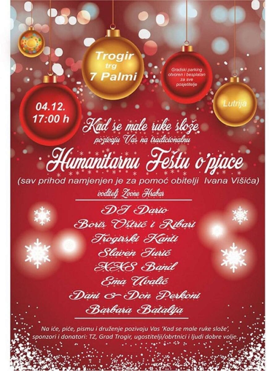 Bliži se vrijeme ZIMSKE ADVENTURE U TROGIRU, to je vrijeme s niz manifestacija koje započinju u petak, 6. prosinaca, a jednu dva dana uoči u srijedu, 4. prosinca organizira skupina građana „Kad se male ruke slože“, to je četvrta po redu Humanitarna Fešta o´ pjace