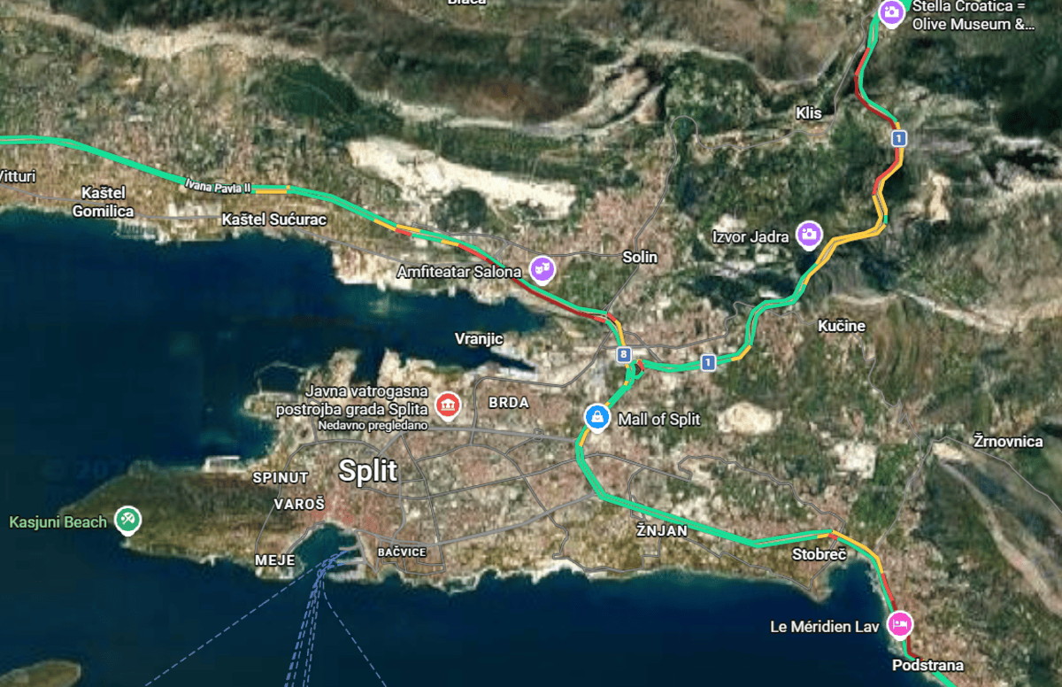 Gužve su standardne u oba smjera: od Podstrane prema Splitu, posebno iza hotela Lav, kao i od Kaštela prema Solinu i Splitu.