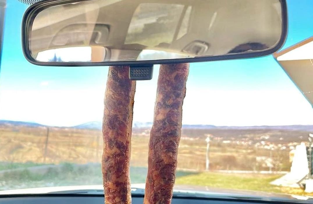 Satirična Facebook stranica Dnevna doza prosječnog Dalmatinca u svojoj novoj objavi ima dalmatinsku deliciju - sušenu kobasicu. Sve bi bilo uobičajeno da kobasa nije na neobičnom mjestu - visi s retrovizora automobila.