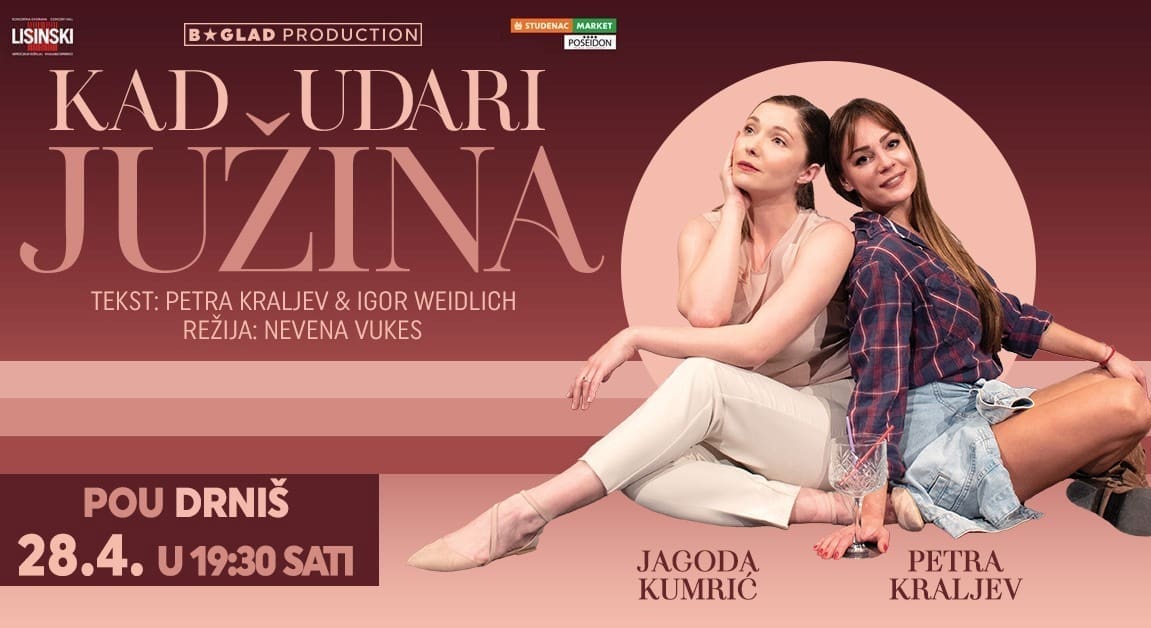 Emotivnu komediju "Kad udari južina" u izvedbi Petre Kraljev i Jagode Kumrić pogledajte u 19:30 sati u dvorani "Ivan Meštrović" u Drnišu.