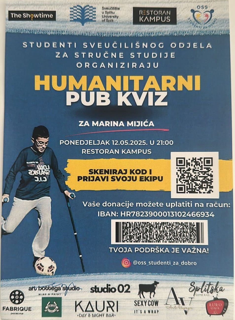 Kviz će se održati 12. svibnja 2025. u restoranu Kampus u Splitu, s početkom u 21 sat, a sav prihod namijenjen je za Marinovo liječenje.