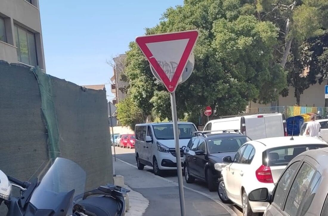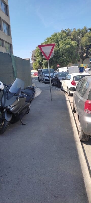 U Dražanac ulici u Split znak koji upozorava na nailaženje sa sporedne ceste na cestu s prednošću prolaska postavljen je nasred pločnika.