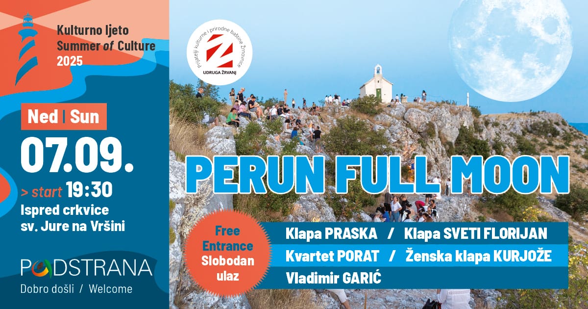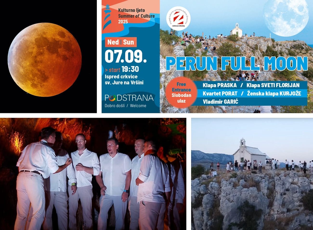 Pod zvjezdanim nebom i pred veličanstvenim kulisama prirode iznad Podstrane, na prostoru ispred crkvice sv. Jure na Vršini, u 19:30 sati započinje četvrto izdanje manifestacije Perun Full Moon. Publiku očekuje večer u kojoj će se zvuk klapske pjesme i tradicijske glazbe stopiti s mitskim ozračjem Peruna. Na pozornicu pod otvorenim nebom staju: Klapa Praska, Klapa Sveti Florijan, Ženska klapa Kurjože, Kvartet Porat te poznati pjevač Vladimir Garić. Svojim nastupima oni će dočarati posebnu energiju ovog prostora, gdje se pjesma, povijest i priroda pretapaju u jedinstveno iskustvo.