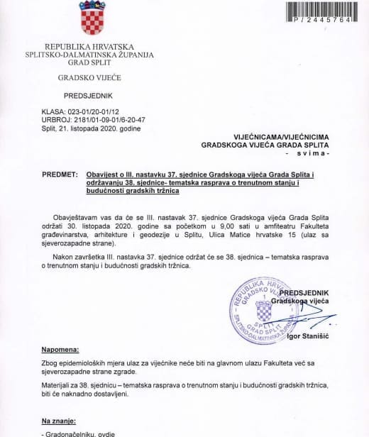 Materijali za sjednicu još uvijek nisu objavljeni na službenim stranicama Grada Splita. Ističu da će materijali biti naknadno dostavljeni vijećnicima.