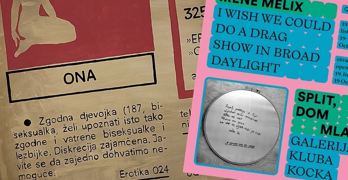 U sklopu programa qIZLOŽBE kolektiva queerANarchive u četvrtak, 19. listopada u 19 sati u Galeriji Kluba Kocka otvara se izložba naziva "Bilo bi baza da možemo radit drag usrid bila dana" umjetnice Irène Mélix.