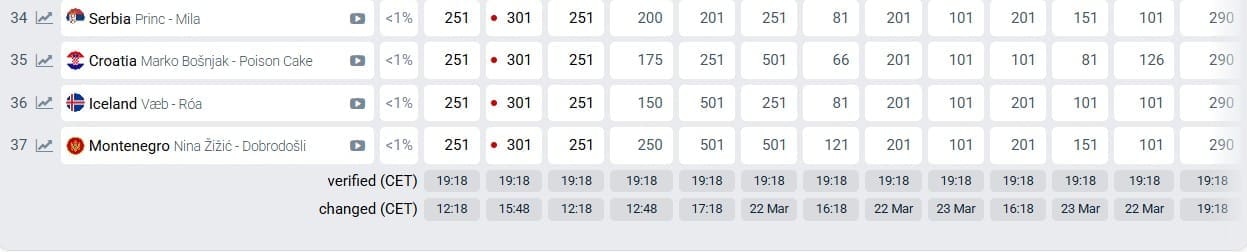 Ovo je značajan pad u odnosu na početak godine, kada je Hrvatska, unatoč neodabranom predstavniku, kotirala na 14. mjestu s 2% šanse za pobjedu.
