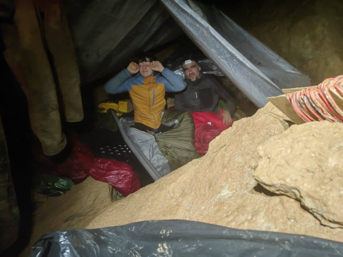 Na dubini od 400 metara speleolozi su zbog natopljene opreme morali napraviti prvi bivak, odnosno privremeno podzemno odmorište.