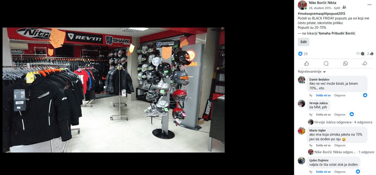 - Gledajući videa o tom shopping ludilu u Americi predložio sam da i mi napravimo taj „Crni petak“ sa popustima od 70% na kacige koje su nam ostale par godina na lageru, i sve kacige su se prodale isti dan i tako je započelo. Nije mi palo na pamet da će cijeli idući tjedan prijatelji i poznanici zadovoljnih kupaca dolaziti i tražiti ima li još robe na tolikom popustu. Iduće godine, kupci su se vraćali cijeli prosinac. Tako da smo već 2014. spojili Crni petak i Božićni popust, a 2016. godine smo „spustili“ popuste sa 70% na 50%, jer je bilo puno nezadovoljnih kupaca koji nisu znali da Crni petak traje samo jedan dan i izašli bi razočarani, praznih ruku. Tako smo stekli povjerenje kupaca koji nam se tradicionalno vraćaju svake godine i kupuju sve što je na 50%, čak i ono što im u tom trenutku i ne treba.