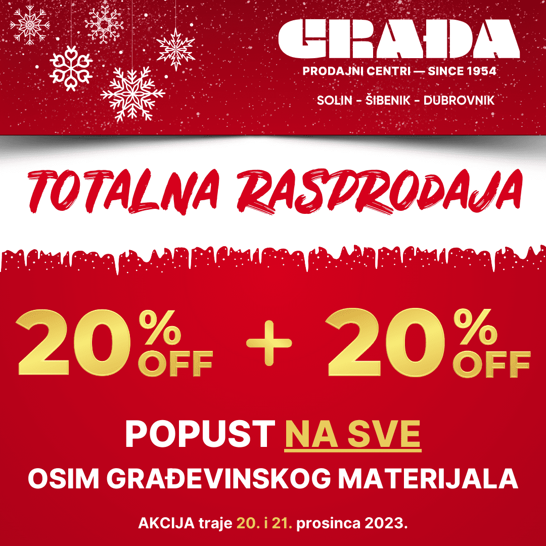 Najavljuju Božićnu akciju svih akcija 20. i 21. prosinca u svojim centrima u Solinu, Šieniku i Dubrovniku te na webshopu. Akcija kakva se može vjerojatno samo u Americi vidjeti. Ovo je totalna rasprodaja. Darivanje započinje s odličnim popustom od 20%, a dodatnih nevjerojatnih 20% se dodaje na cijeli asortiman na svim odjelima — osim građevinskog materijala. Također, prazne se police te kupci mogu očekivati za preko 10,000 artikala istih 20% poklon popusta na koje se dodaje 30% pa do 50%.