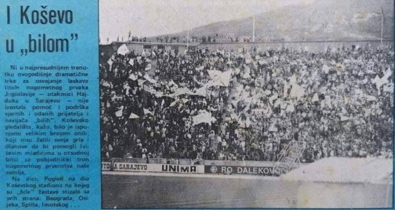 Titula je potvrđena, na sarajevskom stadionu Koševo, gdje su se natiskale tisuće hajdukovih navijača, tada još "Nesvrstanih" sa "divljeg istoka" Starog placa, kako će to kasnije mladim generacijama pričati Prle, jedan od pokretača organiziranog navijanja na poljudskom sjeveru i obnovitelja Torcide.